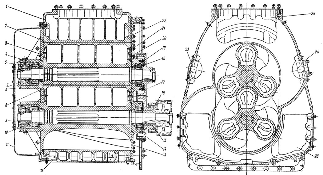 1 — предельный регулятор частоты вращения дизеля; 2 — топливные насосы левой и правой стороны; 3 — кулачковые валы топливных насосов; 4 — верхний коленчатый вал; 5 — вал торсионный; 6″ — шестерня с пружинной муфтой; 7 — шестерня с цеитробежно-фрикциоиной муфтой; я — рабочее колесо воздушного нагнетателя второй ступени; 9 — вертикальная передача; 10 — механизм валоповоротный; 11 — муфта привода генератора; 12 — тяговый генератор; 13 — нижний коленчатый вал; 14 — антивибратор; 15 — насосы водяные; 16 — эластичная шестерня; 17 — насос масляный: 18 — привод тахометра; 19 — муфта разобщительная; 20 — тахометр; 21 — объединенный регулятор частоты вращения и мощности; 22 — шатуны; 23 — поршниния трущихся деталей и охлаждения головок поршней дизеля.