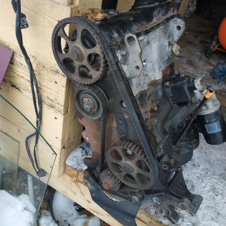 | 1 – впускной газопровод; 2 – пакет катушек зажигания; 3 – зубчатый ремень; 4 – поликлиновой ремень; 5 – шкив с демпфером на коленчатом валу; 6 – масляный насос 7 – впускная трубка масляного насоса; | 8 – коленчатый вал; 9 – шатун; 10 – поршень; 11 – гидравлические толкатели; 12 – клапан; 13 – распределительный вал; |