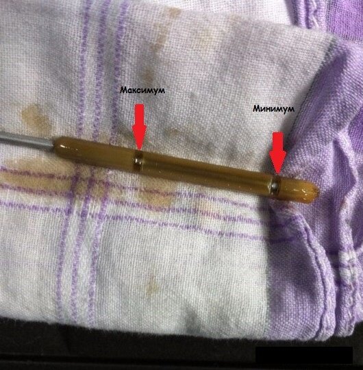 - Когда вытащите еще раз, проверьте уровень. Если он попадает в заштрихованную область или между минимальной и максимальной линиями, все готово.