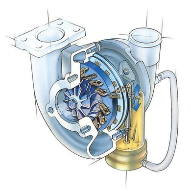 Корпус турбины — Корпус турбины представляет собой чугунный корпус, в котором заключено колесо турбины и перепускной клапан. Выхлопные газы из выпускного коллектора входят в фланцевое входное отверстие корпуса турбины и выходят через отверстие большого диаметра в его центре, к которому присоединяется выпускная труба.