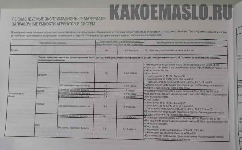 2.0 (QR 20DE), объем масла – 3,9 литра, допуск и вязкость: API-SH, SJ; SAE 5w-30, 10W-30, 10W-40, 5W-40