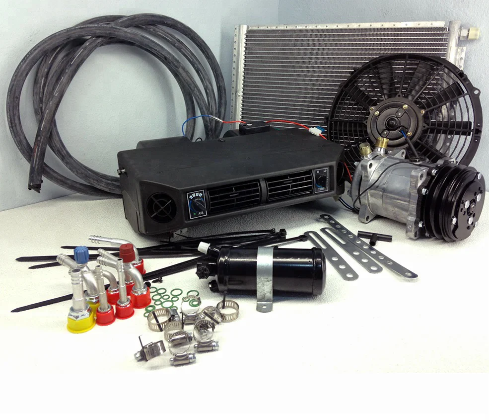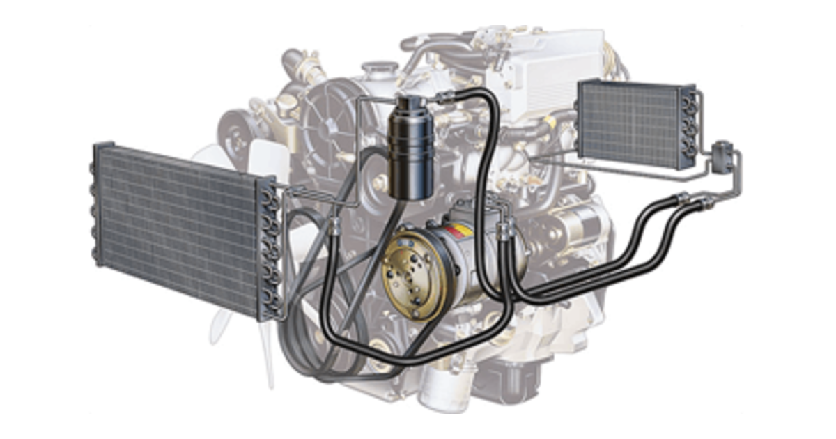 Система кондиционирования воздуха состоит из множества компонентов, включая компрессор, который приводится в действие двигателем; расширительный клапан, регулирующий поток хладагента; и два теплообменника, включая испаритель и конденсатор. Хладагент — это жидкость, которая превращается в газ и обратно в жидкую форму, протекая по всей системе.