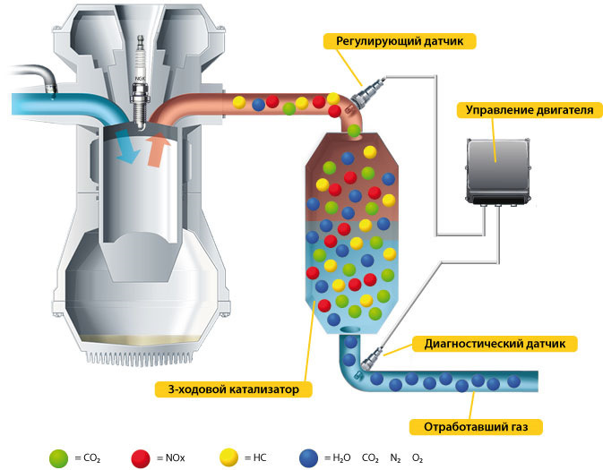 Элемент установлен между первой и второй группами кислородных датчиков (лямбда-зондов), контролирующих параметры отработавших газов: температуру, содержание вредных примесей. Соты создают противодействие потоку выхлопов, тормозят их скорость. В этот момент на напылении сот происходит догорание газов, поступающих из цилиндров двигателя. В результате химической реакции (катализации) сокращается токсичность веществ, выбрасываемых вовне.