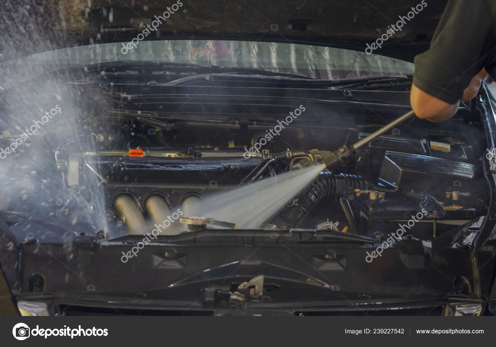 Все просто. Впоследствии “укутывания” элементов систем зажигания, а также электропитания полиэтиленовой пленкой на движок опускается струя горячей воды под значительным давлением, которая вымывает всяческую грязь. Существует много плюсов чистого двигателя. Во-первых, это пожарная безопасность. Пятна масла на горячем двигателе могут загореться. В реальности редко встретишь такую ситуацию, но однако попавшее на коллектор масло может задымиться и испускать дым некоторое время.