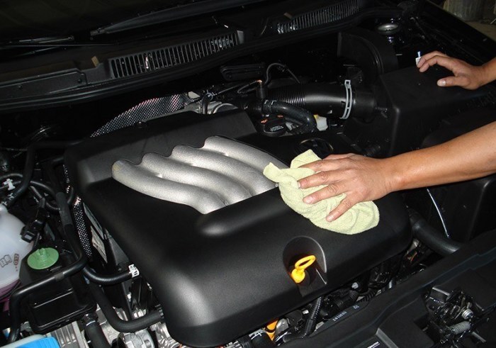 Для уборки под капотом безопаснее всего использовать обычный пылесос. Перед работой нужно снять пластиковые крышки, закрывающие двигатель, а также защиту картера. Убрать сильно засохшие места помогут сухие щетки. Главное во время чистки не повредить провода.