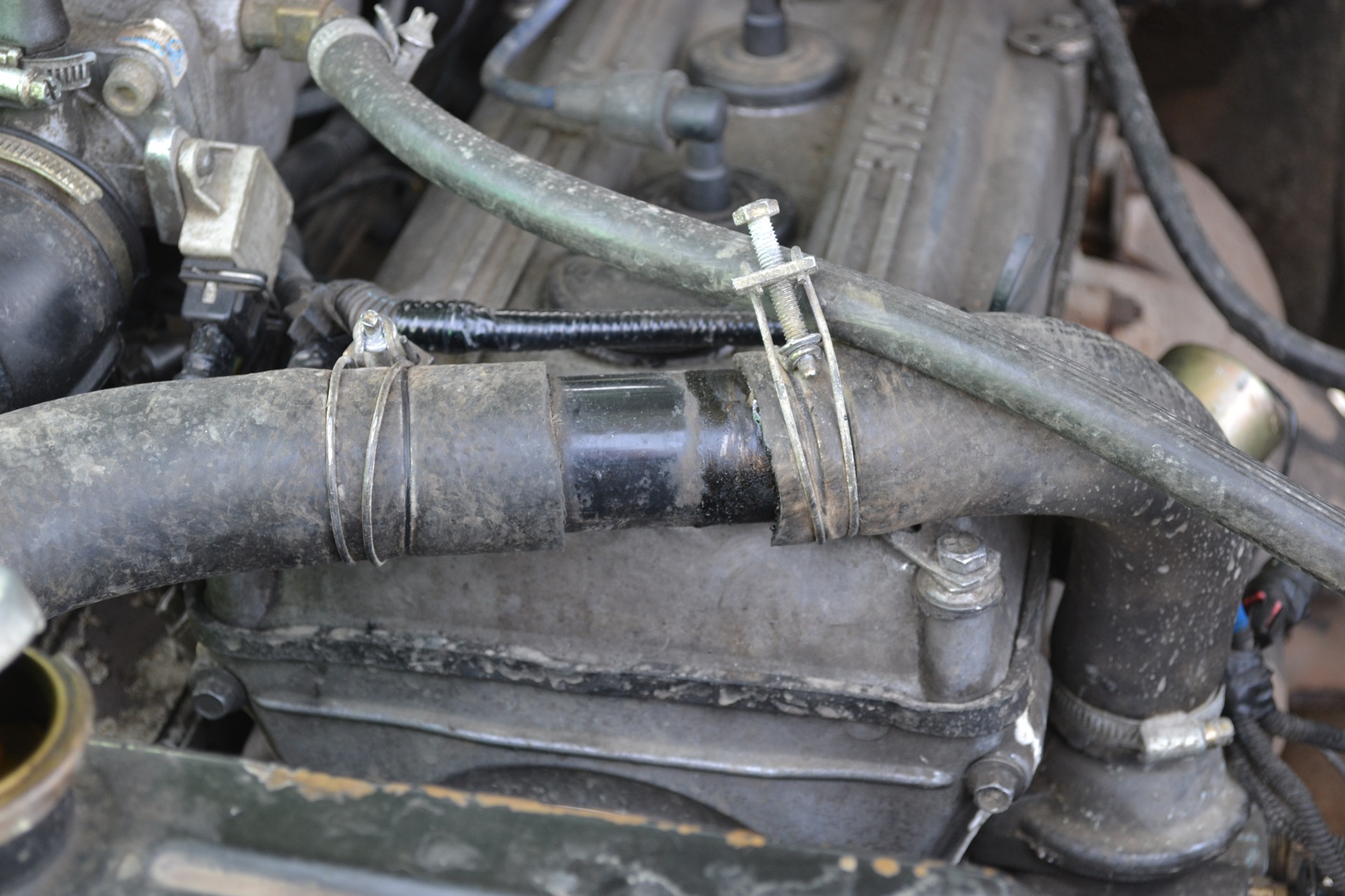 Сняв патрубок подогрева дроссельного узла, выпустите воздух, а после того, как антифриз начнет вытекать, немедленно наденьте штуцер и зафиксируйте его хомутом.