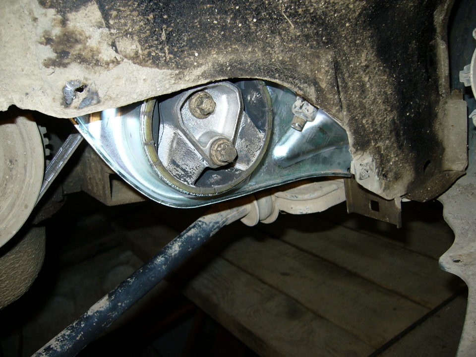Для замены подушки правой опоры силового агрегата достаточно снять только правую часть брызговика, а для замены подушки левой опоры — левую часть. Для замены подушки задней опоры брызговик снимать не нужно