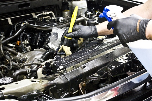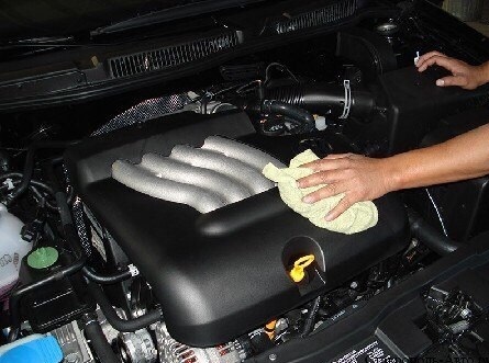 Первое, что нужно сделать, это удалить лишнюю влагу из всех щелей, пазов и углублений подкапотного пространства.