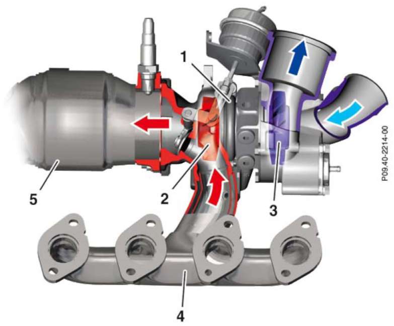 Для этого, прежде чем выхлопные газы должны быть выведены в выхлопную трубу, а далее и, соответственно, в атмосферу, их поток направляется через систему турбокомпрессора.