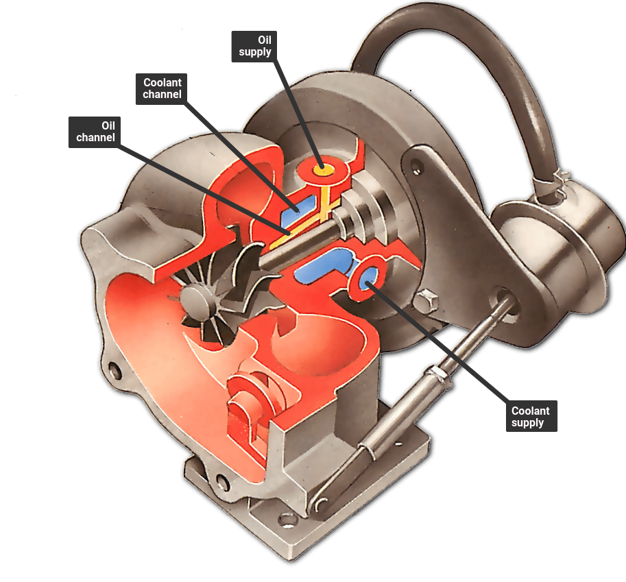 Ось турбонагнетателя закреплена на специальных подшипниках скольжения; смазка осуществляется подачей масла из системы смазки моторного отсека. Уплотнительные кольца и прокладки препятствуют утечкам масла, а также прорывам воздуха и отработанных газов, а также их смешиванию. Конечно, полностью исключить попадание выхлопа в сжатый атмосферный воздух не удаётся, но в этом и нет большой необходимости…