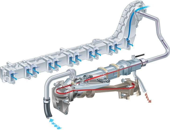 Охладитель ЕГР соединен непосредственно с клапаном ЕГР. Дополнительное охлаждение выпускных газов позволяет еще больше снизить выброс вредных выбросов (оксидов азота) в атмосферу.