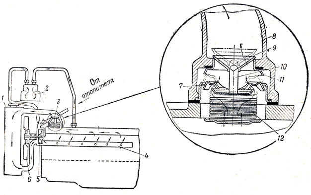 Выпускной клапан открывается при внутреннем избыточном давлении в 1 кГ/см. кв., что обеспечивает повышение температуры кипения охлаждающей жидкости до 119 град. Цельсия. В случае кипения охлаждающей жидкости в радиаторе для отвода пара наружу в горловине верхнего бочка радиатора установлена пароотводящая трубка. При охлаждении жидкости в герметичной системе появляется разряжение , что может привести к смятию бочков и трубок радиатора. Для сигнализации о закипании охлаждающей жидкости в верхнем бочке радиатора установлен электрический импульсный датчик контрольной лампы аварийной температуры 115 град. Цельсия.