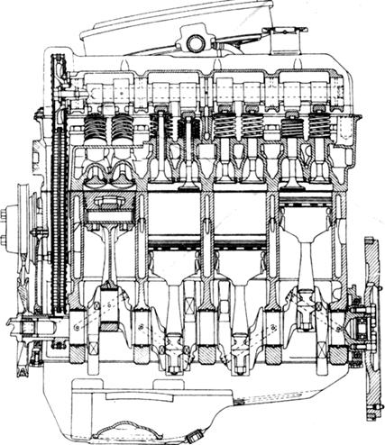 Поршни имеют два компрессионных и одно маслосъемное кольцо. Коленчатый вал вращается в пяти опорах в блоке цилиндров. От шкива на его переднем конце клиноременной передачей приводятся во вращение генератор и насос охлаждающей жидкости, расположенные с правой стороны двигателя.