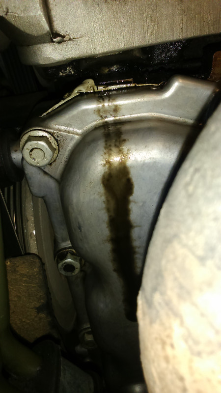 Посмотрите также на нижнюю часть двигателя под уплотнением и на отстойник кастрюля для масляных полос, начинающихся от нижнего края уплотнения.
