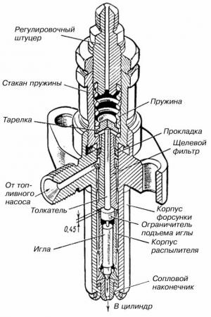 Пробка вворачивается в стакан и контрогаится. В пробке имеется отверстие для просочившегося топлива и на неё наворачивается трубка низкого давления. В корпусе находится щелевой фильтр, на котором 24 проточки (12 снизу и 12 сверху). Внутри щелевого фильтра установлен толкатель. Ниже в корпусе установлен корпус распылителя с тремя лысками и тремя отверстиями. Внутри корпуса распылителя находится игла.
