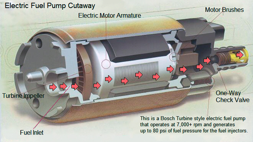 Электрические топливные насосы были внедрены потому, что они лучше отвечали потребностям систем впрыска топлива. Электрические топливные насосы могут создавать гораздо большее давление, чем традиционные механические топливные насосы. Обычно они работают при давлении около 60 фунтов на квадратный дюйм. Этого давления достаточно, чтобы распылить топливо, когда оно впрыскивается в цилиндры.
