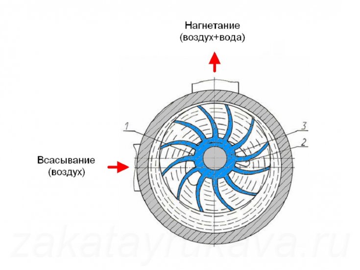 Работа этого оборудования базируется на создании герметичности рабочего объема за счет использования воды. При запуске двигателя воду по стенкам корпуса перегоняет крыльчатка. Между ротором и жидкостью образуется область вакуума, а лопатки вымещают газ в выходное отверстие.