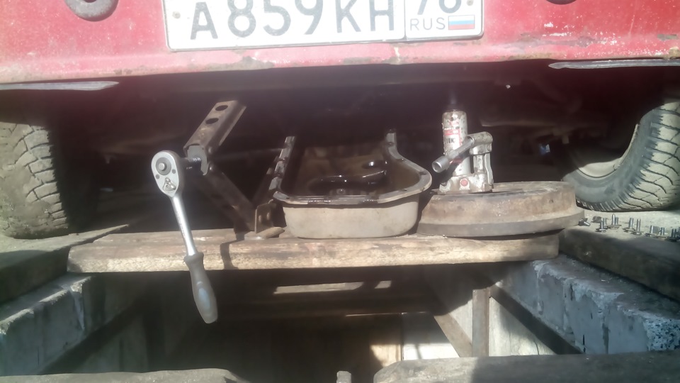 Откручиваем 19 болтов крепления поддона - Используя домкрат, а лучше два, осуществить поднятие двигателя через проставки в виде досок. Если есть лебедка и возможность ее закрепления в гараже, то лучше воспользоваться ею. Если ее нет, то подойдет 2 домкрата, при помощи которых нужно вывесить двигатель, чтобы открутить все болты крепления крышки поддона, и извлечь ее.