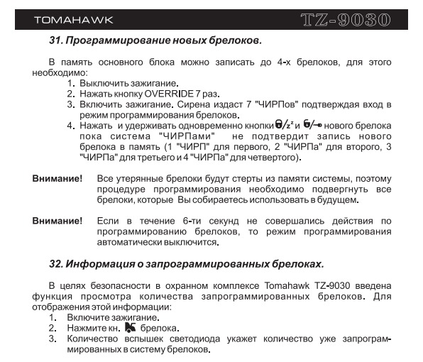 Будьте осторожны и используйте точную инструкцию своей модели брелка и сигнализации Tomahawk! Далее описаны действия для одной из разновидностей Томагавк!