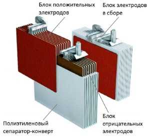 Гальванические элементы, количество которых обычно достигает 6 штук, внутри батареи соединены между собой установленными свинцовыми перемычками. Подобная методика сборки применяется практически всеми производителями.