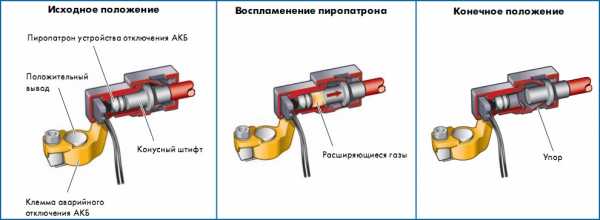 В схеме подключения аккумуляторной батареи для безопасности могут применяться пиропатроны или реле отключения, особенно если она располагается в салоне или в багажнике. Задача этих элементов отсоединить от батареи провод стартера и генератора в момент аварии, т.к. замыкание этих проводов может вызвать возгорание. Но электропитание бортовой сети сохраняется для обеспечения функций безопасности (аварийная сигнализация, освещение и др.)