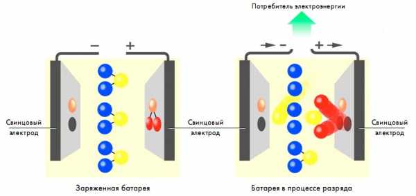 Процесс разряда АКБ характеризуется отдачей потребителям батареи электрической энергии. Идет обратный химический процесс – химическая энергия проходит преобразование в электрическую.
