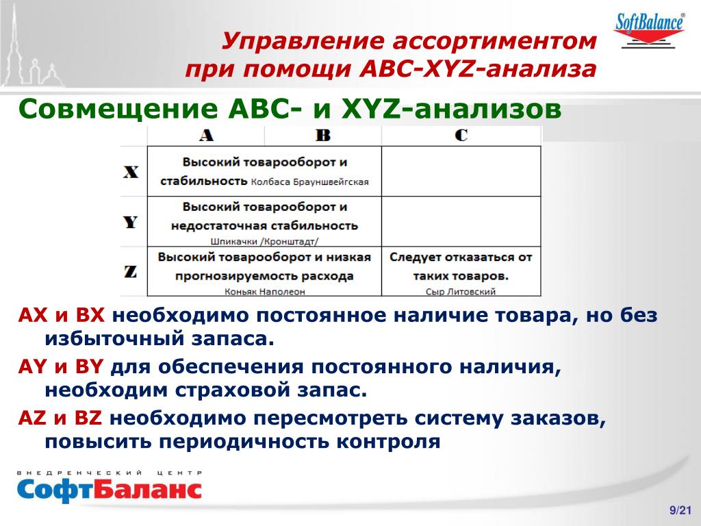 После разделения всех товаров на группы АВС, формируются решения относительно каждой товарной группы. Основные направления выводов, которые могут быть сделаны в результате проведения АВС-анализа: