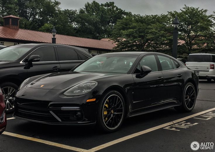 черный porsche panamera 4 парковка на городской улице со старыми зданиями. салон porsche panameraPREMIUM
