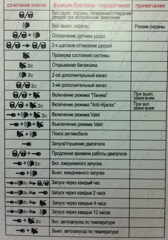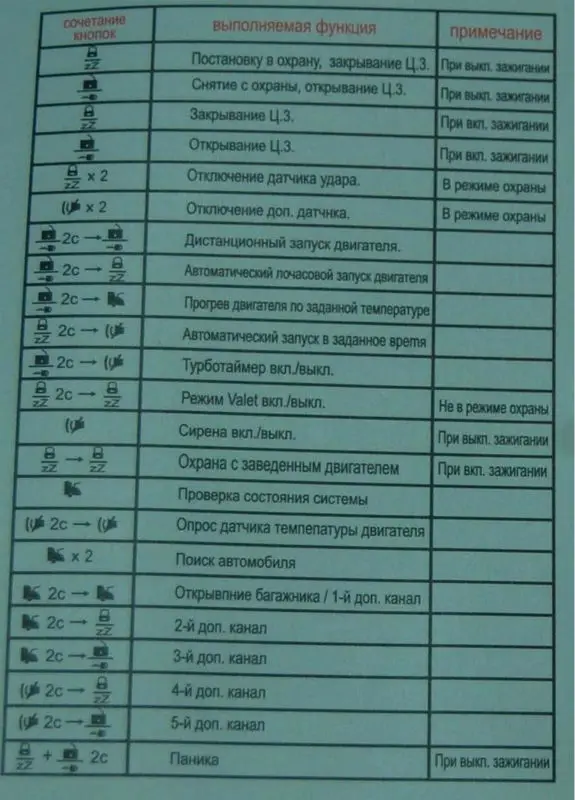 В ответ будут поданы двойные сигналы габаритных огней и сирены. Опять же, в зависимости от настроек, подтверждение снятия с охраны может быть передано на Tomahawk TZ-9.010 брелок. В инструкции по эксплуатации указано, что отключение функции защиты вовсе не означает автоматический запуск двигателя и разблокировку стартера. Для выполнения этого действия необходимо нажать комбинированный набор кнопок, который был выбран заранее в режиме программирования. По такой же схеме реализован автозапуск, который, в свою очередь, также не приводит к автоматическому снятию автомобиля с охраны.