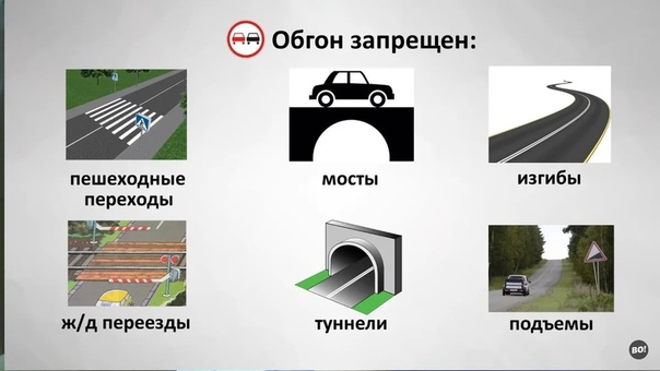 Водителю не разрешается совершать обгон при приближении к гребню уклона или повороту шоссе (по сути, гребень уклона — это изменение высоты дороги). Водитель также не должен совершать обгон при проезде через железнодорожный переезд, любой перекресток и при проезде официальных временных предупреждающих знаков, указывающих на то, что на работе работают мужчины, и, очевидно, при проезде запрещенной зоны обгона это довольно просто.