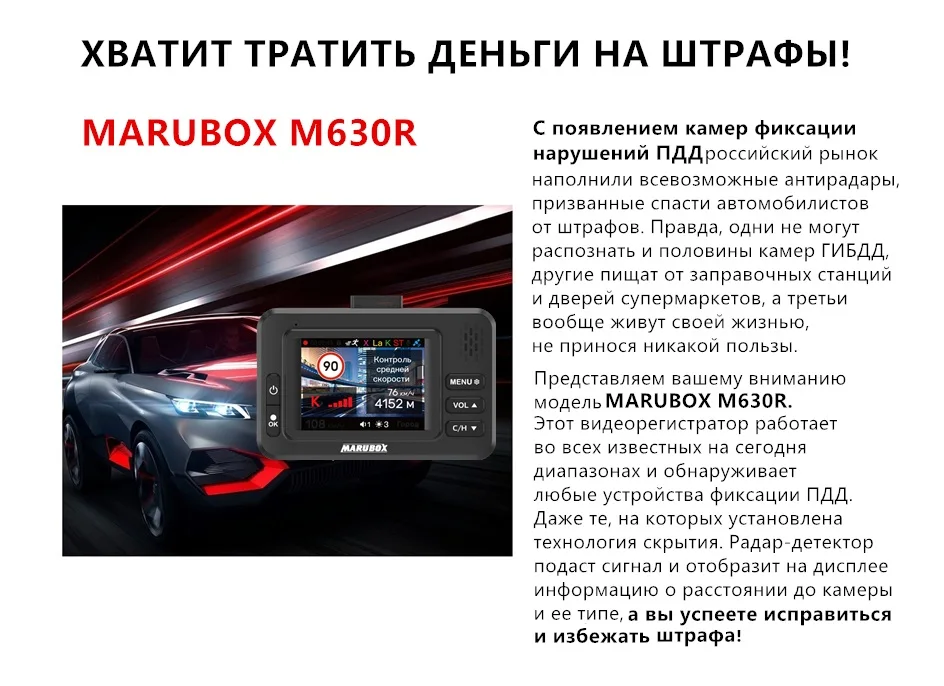 Миниатюрный трекер, оповещающий о любых стационарных устройствах контроля. Сообщает о приближении к камере звуковым сигналом на расстоянии 500 метров. Дисплей со световыми индикаторами показывает направление движения, текущую скорость, дистанцию до ближайшего прибора фотофиксации.