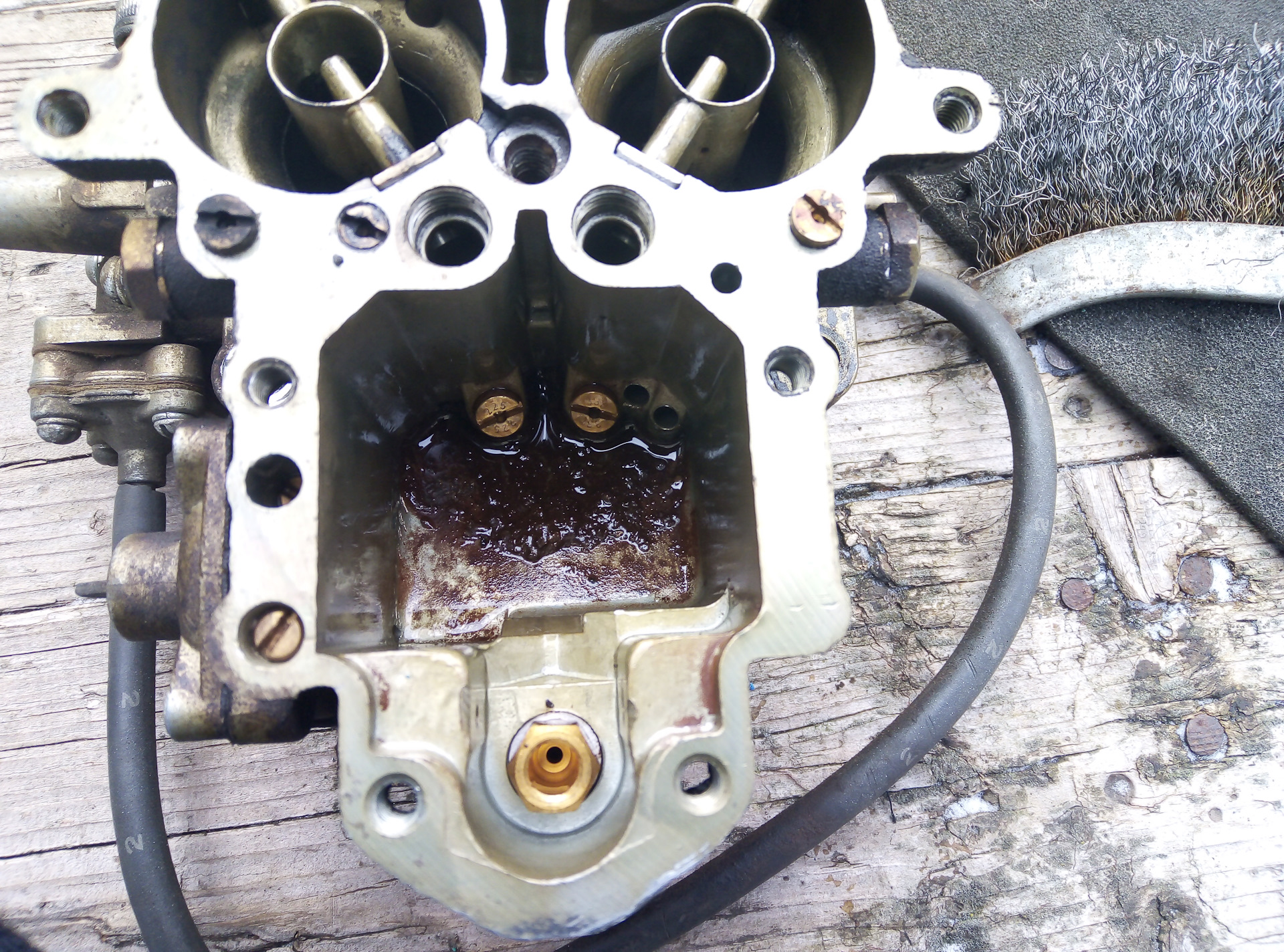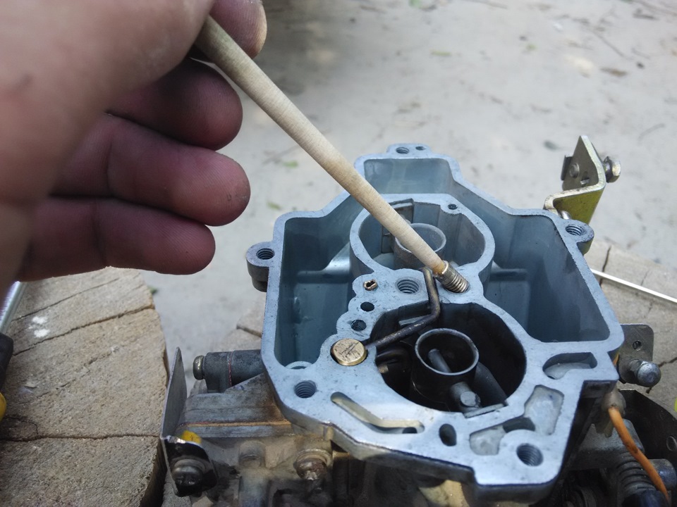 Отложения могут накапливаться годами на дне поплавковой камеры, не оказывая влияния на работу карбюратора. Если же их стало так много, что появились явные признаки засорения главных топливных жиклеров, одной лишь промывкой дна камеры исправить положение не удастся. В этом случае наполните поплавковую камеру чистым бензином, выверните главные воздушные жиклеры вместе с эмульсионными трубками и извлеките главные топливные жиклеры, вывернув их длинной отверткой и плотно вставив в отверстие заостренную палочку. Затем продуйте сверху сильной струей воздуха эмульсионные колодцы. При этом из отверстий главного топливного канала будут выходить пузыри воздуха, вынося в поплавковую камеру загрязнения.