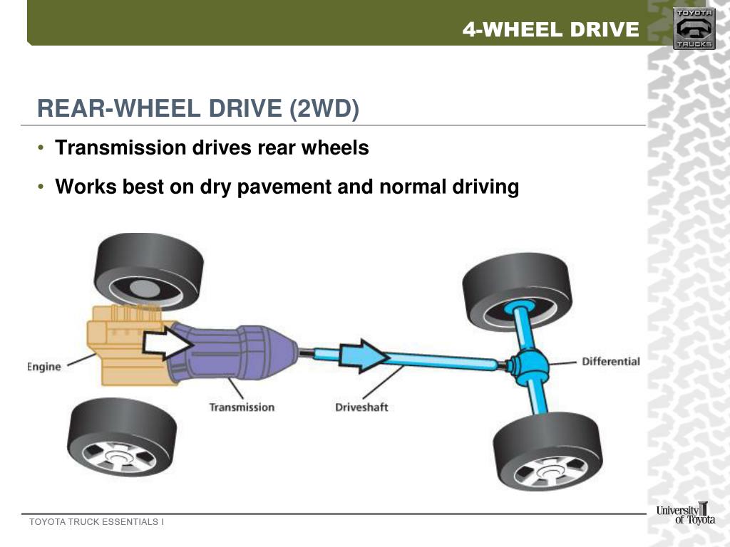 Привод на 2 колеса (2WD)Как упоминалось ранее, большинство автомобилей имеют 2WD, который может быть в одной из двух конфигураций: с передним приводом (FWD) или с задним приводом (RWD) .