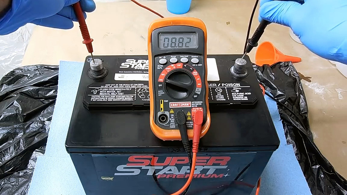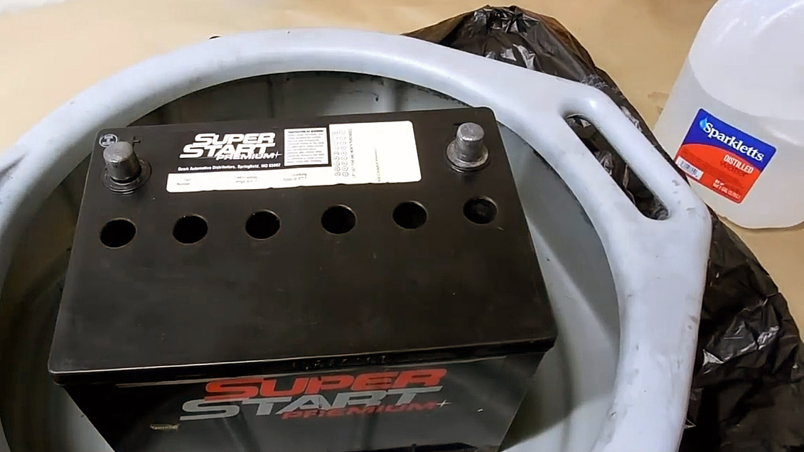 Используя его, восстановить работоспособность прибора можно менее, чем за 60 минут.Если автомобильный аккумулятор полностью разрядился, его нужно будет заранее зарядить. Из заряженного АКБ необходимо полностью слить старый электролит, открутив пробки на крышке, после чего конструкцию можно промыть водой. Как и в предыдущих случаях, для этого лучше использовать дистиллят.