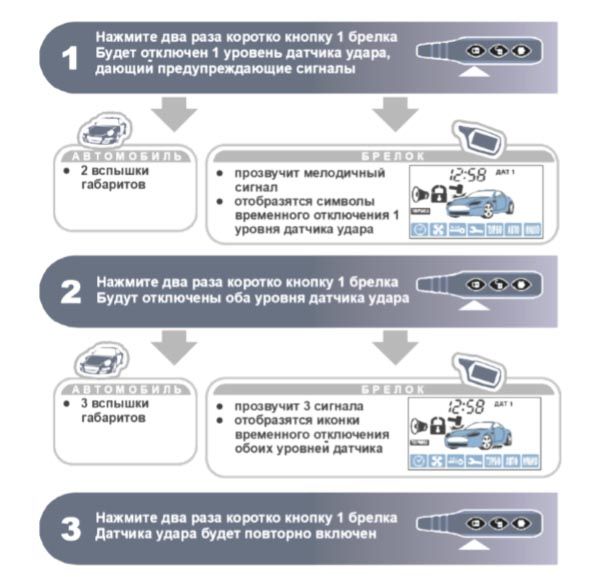 Количество кликов варьируется в зависимости от модели сигнализации, но обычно это три или четыре клика. После включения зажигания необходимо успеть нажать на клавиши в течение двадцати секунд.Отключение сигнализации кодом