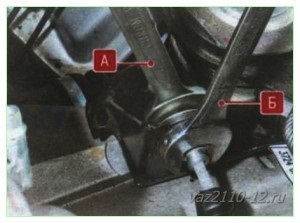 - Откручиваем гайки, которыми фиксируется в кронштейне на ваз 2112 трос сцепления с помощью двух ключей на 19 (одним крутим, вторым придерживаем)