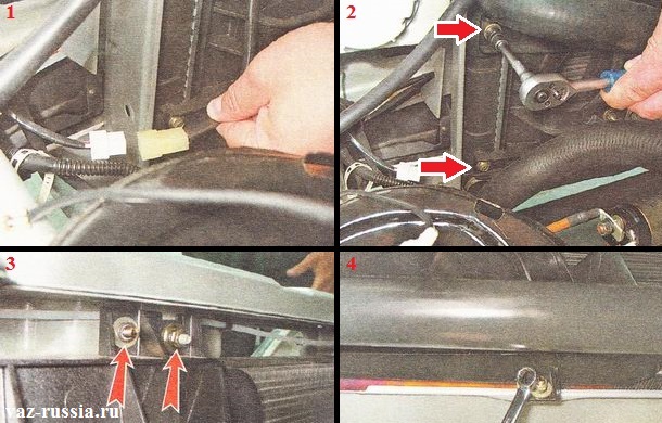 - Радиатор вместе с электровентилятором крепится в верхней части к раме автомобиля. Необходимо снять верхние крепления и убрать вентилятор.