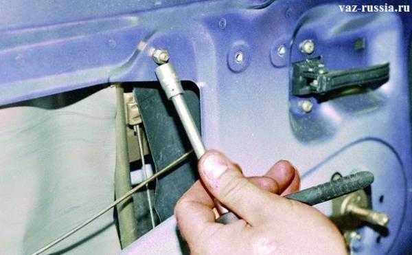 Чтобы механизм стеклоподъёмника можно было вынуть из двери и тем самым полностью снять, выверните ко всему этому два винта которые ручку открывания двери к автомобилю крепят (см. фото 1), после отворачивания винтов, снимите ручку протолкнув её для этого во внутреннюю часть двери и через вырез в двери её тем самым выведите (см. фото 2), затем с помощью тонких плоскогубец или же пассатижей или просто рукой можно, отсоедините резиновый держатель который тягу на ручки удерживает (см. фото 3) и после этого тягу от ручку отсоедините и вы сможете полностью снять её таким образом с автомобиля (см.