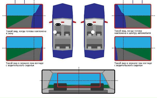 Зеркала заднего вида на автомобиле следует настраивать так, чтобы водитель видел в отражении часть своего автомобиля, асфальт и немного того, что над ним. При этом автомобилист не должен крутить головой, приближаться к зеркалу или наклоняться — в левое он смотрит глазами, почти без поворота головы, в правое — слегка повернув голову.