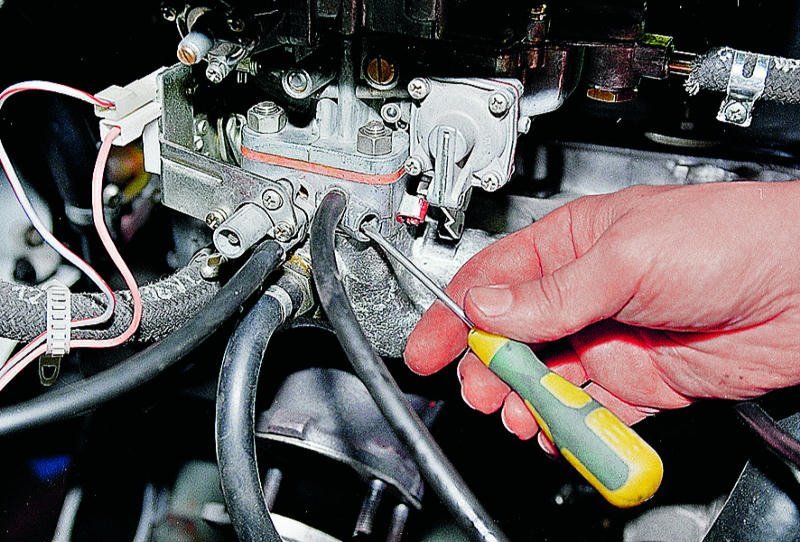На прогретом двигателе нужно: отверткой приоткрыть воздушную заслонку, принудительно, на 1/3 ее поворота. Затем, подгибаем тягу дроссельной заслонки до 3200-3400 об./мин.