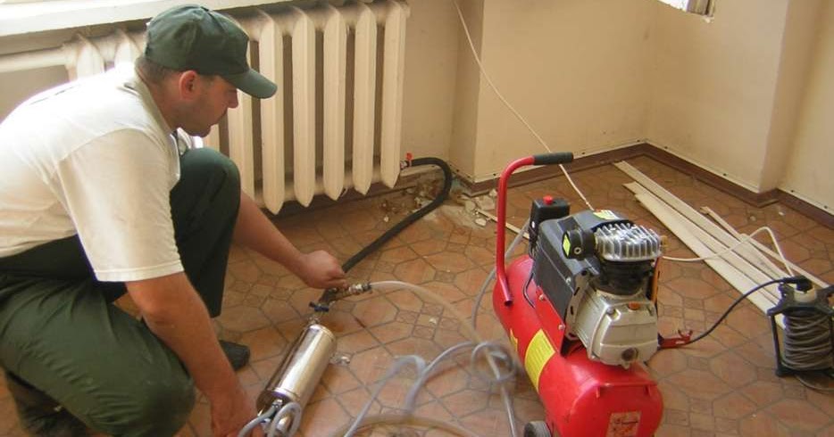 Пожалуй, это наиболее эффективный и вместе с тем самый дорогой способ. Для его реализации потребуется воздушный компрессор. С его помощью в стояк нагнетают воздушно-водяную смесь. Высокое давление создает такую ситуацию, которая приводит к тому, от стенок трубы или радиатора начнется отделение накипи. Такой способ очистки максимально эффективен для чугунных радиаторов. Гидравлическая очистка не требует использования каких-либо химикатов и ее на полном основании можно определить как экологически безопасную. Но для качественной очистки батарей домовладелец должен отсоединить батареи и доставить в специализированный сервисный центр, в котором есть такой компрессор. И тогда вопрос – как правильно продуть батареи отопления будет снят с повестки.