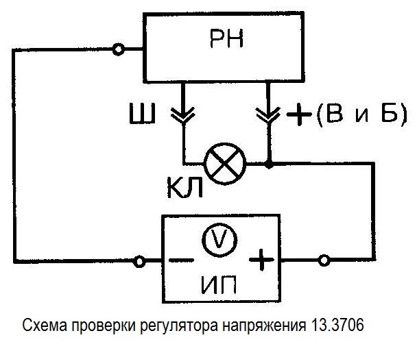 Плюсовой провод подсоединяем к клеммам «Б» и «В», минус подаем на корпус. Контрольную лампочку соединяем с клеммами «В» и «Ш». Далее делаем все точно так же, как и с совмещенным стабилизатором. Плавно поднимаем нагрузку, при достижении 14,5 вольт должна произойти отсечка. Если отсечки нет, то меняем регулятор.