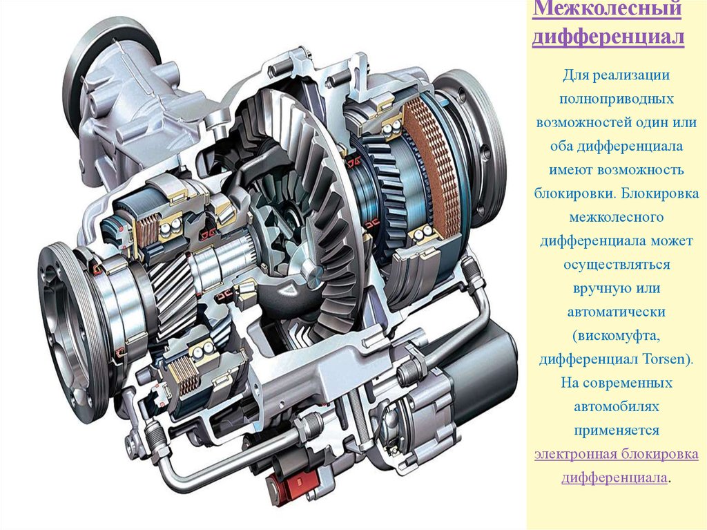 Межосевой дифференциал исключает циркуляцию мощности в трансмиссии автомобиля, которая очень сильно нагружает трансмиссию, особенно при движении по ровной дороге. В качестве межосевых на автомобилях применяются и конические, и цилиндрически дифференциалы.