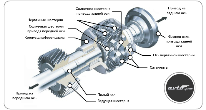 Полноприводные и полноприводные автомобили имеют центрально расположенный дифференциал, распределяющий мощность на