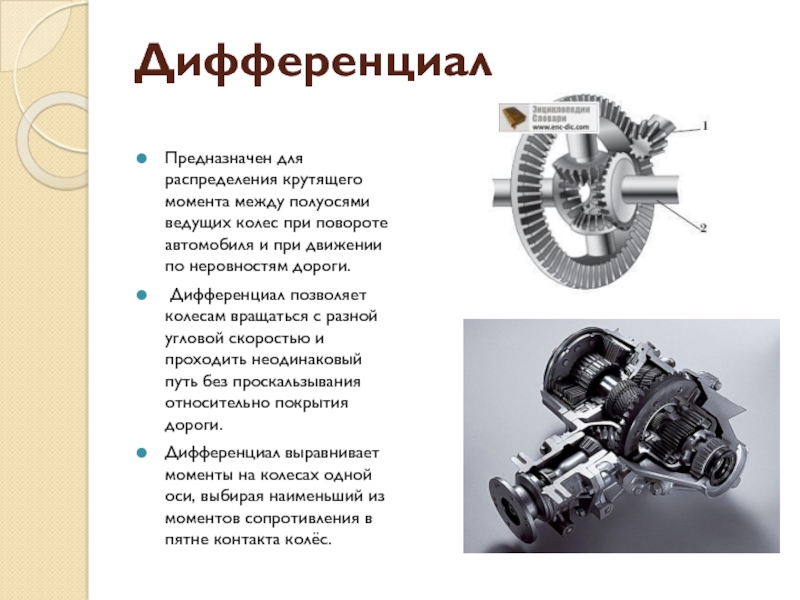 Механизм трансмиссии, распределяющий крутящий момент двигателя между ведущими колесами и ведущими мостами автомобиля, называется дифференциалом. Дифференциал служит для обеспечения ведущим мостам разной скорости вращения при движении автомобиля по неровным дорогам и на поворотах.