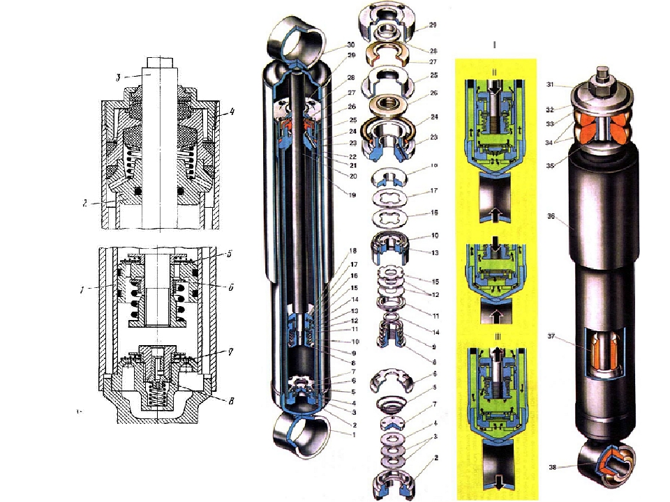ΠΠ΄Π½ΠΎΡΡΡΠ±Π½ΡΠ΅ ΠΈ Π΄Π²ΡΡ ΡΡΡΠ±Π½ΡΠ΅ Π°ΠΌΠΎΡΡΠΈΠ·Π°ΡΠΎΡΡ Π²ΡΠΏΠΎΠ»Π½ΡΡΡ ΠΎΠ΄Π½ΠΈ ΠΈ ΡΠ΅ ΠΆΠ΅ Π·Π°Π΄Π°ΡΠΈ, Π½ΠΎ ΠΎΡΠ»ΠΈΡΠ°ΡΡΡΡ ΠΊΠΎΠ½ΡΡΡΡΠΊΡΠΈΠ΅ΠΉ. ΠΠ΄Π½ΠΎΡΡΡΠ±Π½ΡΠΉ Π³Π°Π·ΠΎΠ²ΡΠΉ Π°ΠΌΠΎΡΡΠΈΠ·Π°ΡΠΎΡ Π·Π°ΠΏΠΎΠ»Π½ΡΠ΅ΡΡΡ ΠΌΠ°ΡΠ»ΠΎΠΌ ΠΈ Π³Π°Π·ΠΎΠΌ ΠΏΠΎΠ΄ Π΄Π°Π²Π»Π΅Π½ΠΈΠ΅ΠΌ 25-30 Π±Π°Ρ, Π° ΠΏΠΎΠ΄Π²ΠΈΠΆΠ½ΡΠΉ ΠΏΠΎΡΡΠ΅Π½Ρ ΡΠ΅ΠΏΠ°ΡΠ°ΡΠΎΡΠ° ΡΠ°Π·Π΄Π΅Π»ΡΠ΅Ρ ΡΡΠΈ Π΄Π²Π° Π²Π΅ΡΠ΅ΡΡΠ²Π°. ΠΠΎΡΡΠ½Π΅Π²ΠΎΠΉ ΠΊΠ»Π°ΠΏΠ°Π½, ΠΏΡΠΈΠΊΡΠ΅ΠΏΠ»Π΅Π½Π½ΡΠΉ ΠΊ ΡΡΠΎΠΊΡ ΠΏΠΎΡΡΠ½Ρ, ΡΠ΅Π³ΡΠ»ΠΈΡΡΠ΅Ρ ΠΏΠΎΡΠΎΠΊ ΠΌΠ°ΡΠ»Π° ΠΈ Π΄Π΅ΠΌΠΏΡΠΈΡΡΡΡΠΈΠΉ ΡΡΡΠ΅ΠΊΡ.