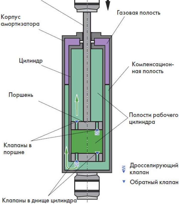 ΠΡΠ½ΠΎΠ²Π½ΠΎΠΉ ΠΏΡΠΈΠ½ΡΠΈΠΏ Π°ΠΌΠΎΡΡΠΈΠ·Π°ΡΠΎΡΠ° Π·Π°ΠΊΠ»ΡΡΠ°Π΅ΡΡΡ Π² ΡΠΎΠΌ, ΡΡΠΎ ΠΏΡΠΈ ΡΠΆΠ°ΡΠΈΠΈ ΠΈΠ»ΠΈ ΠΎΡΡΠΊΠΎΠΊΠ΅ Π±Π»ΠΎΠΊΠ° ΠΊΠ»Π°ΠΏΠ°Π½Ρ Π²Π½ΡΡΡΠΈ Π·Π°ΠΏΠΎΠ»Π½Π΅Π½Π½ΠΎΠΉ ΠΌΠ°ΡΠ»ΠΎΠΌ ΡΡΡΠ±ΠΊΠΈ ΠΎΠ³ΡΠ°Π½ΠΈΡΠΈΠ²Π°ΡΡ ΠΏΠΎΡΠΎΠΊ ΠΌΠ°ΡΠ»Π°, ΡΡΠΎΠ±Ρ ΡΠΌΠ΅Π½ΡΡΠΈΡΡ Π΄Π²ΠΈΠΆΠ΅Π½ΠΈΠ΅ ΠΏΠΎΡΡΠ½Ρ. ΠΡΠΎ ΡΠΌΠ΅Π½ΡΡΠ°Π΅Ρ ΠΊΠΎΠ»Π΅Π±Π°Π½ΠΈΡ Π΄ΠΎΡΠΎΠΆΠ½ΠΎΠΉ ΡΠ΅ΡΡΠΎΡΡ, ΡΠ΄Π΅ΡΠΆΠΈΠ²Π°Ρ ΡΠΈΠ½Ρ Π² ΠΊΠΎΠ½ΡΠ°ΠΊΡΠ΅ Ρ Π΄ΠΎΡΠΎΠ³ΠΎΠΉ ΠΈ ΡΠ»ΡΡΡΠ°Ρ ΠΊΠΎΠΌΡΠΎΡΡ Π΅Π·Π΄Ρ.