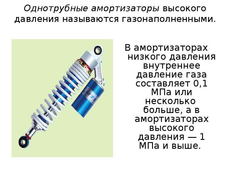 ΠΡΠΎ Π³Π°Π·ΠΎΠ²ΡΠ΅ Π°ΠΌΠΎΡΡΠΈΠ·Π°ΡΠΎΡΡ Π²ΡΡΠΎΠΊΠΎΠ³ΠΎ Π΄Π°Π²Π»Π΅Π½ΠΈΡ Ρ ΠΎΠ΄Π½ΠΎΠΉ ΡΡΡΠ±ΠΊΠΎΠΉ — Π½Π°ΠΏΠΎΡΠ½ΠΎΠΉ. ΠΠ½ΡΡΡΠΈ Π½Π°ΠΏΠΎΡΠ½ΠΎΠΉ ΡΡΡΠ±ΠΊΠΈ Π½Π°Ρ ΠΎΠ΄ΡΡΡΡ Π΄Π²Π° ΠΏΠΎΡΡΠ½Ρ: Π΄Π΅Π»ΠΈΡΠ΅Π»ΡΠ½ΡΠΉ ΠΏΠΎΡΡΠ΅Π½Ρ ΠΈ ΡΠ°Π±ΠΎΡΠΈΠΉ ΠΏΠΎΡΡΠ΅Π½Ρ. Π Π°Π±ΠΎΡΠΈΠΉ ΠΏΠΎΡΡΠ΅Π½Ρ ΠΈ ΡΡΠΎΠΊ ΠΎΡΠ΅Π½Ρ ΠΏΠΎΡ ΠΎΠΆΠΈ Π½Π° ΠΊΠΎΠ½ΡΡΡΡΠΊΡΠΈΡ Π΄Π²ΡΡ ΡΡΡΠ±Π½ΠΎΠ³ΠΎ Π°ΠΌΠΎΡΡΠΈΠ·Π°ΡΠΎΡΠ°. Π Π°Π·Π½ΠΈΡΠ° Π² ΡΠ°ΠΊΡΠΈΡΠ΅ΡΠΊΠΎΠΌ ΠΏΡΠΈΠΌΠ΅Π½Π΅Π½ΠΈΠΈ Π·Π°ΠΊΠ»ΡΡΠ°Π΅ΡΡΡ Π² ΡΠΎΠΌ, ΡΡΠΎ ΠΎΠ΄Π½ΠΎΡΡΡΠ±Π½ΡΠΉ Π°ΠΌΠΎΡΡΠΈΠ·Π°ΡΠΎΡ ΠΌΠΎΠΆΠ΅Ρ Π±ΡΡΡ ΡΡΡΠ°Π½ΠΎΠ²Π»Π΅Π½ Π²Π²Π΅ΡΡ Π½ΠΎΠ³Π°ΠΌΠΈ ΠΈΠ»ΠΈ ΠΏΡΠ°Π²ΠΎΠΉ ΡΡΠΎΡΠΎΠ½ΠΎΠΉ Π²Π²Π΅ΡΡ ΠΈ Π±ΡΠ΄Π΅Ρ ΡΠ°Π±ΠΎΡΠ°ΡΡ Π² Π»ΡΠ±ΠΎΠΌ ΡΠ»ΡΡΠ°Π΅. ΠΠΎΠΌΠΈΠΌΠΎ Π³ΠΈΠ±ΠΊΠΎΡΡΠΈ ΠΌΠΎΠ½ΡΠ°ΠΆΠ°, ΠΎΠ΄Π½ΠΎΡΡΡΠ±Π½ΡΠ΅ Π°ΠΌΠΎΡΡΠΈΠ·Π°ΡΠΎΡΡ, Π½Π°ΡΡΠ΄Ρ Ρ ΠΏΡΡΠΆΠΈΠ½ΠΎΠΉ, ΡΠ²Π»ΡΡΡΡΡ Π²Π°ΠΆΠ½ΡΠΌ ΠΊΠΎΠΌΠΏΠΎΠ½Π΅Π½ΡΠΎΠΌ Π² ΠΏΠΎΠ΄Π΄Π΅ΡΠΆΠ°Π½ΠΈΠΈ Π²Π΅ΡΠ° Π°Π²ΡΠΎΠΌΠΎΠ±ΠΈΠ»Ρ.