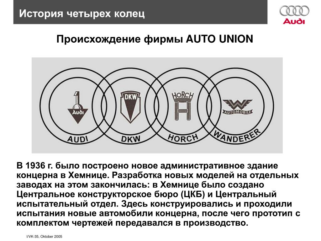 История знакомых сегодня всем «четырех колец» началась в 1932 году, когда четыре саксонских предприятия по выпуску автомобилей — Audi, DKW, Horch и Wanderer — объединились и образовали компанию Auto Union AG. В довоенной Германии она была второй по величине и считается предшественницей нынешнего концерна Audi AG.