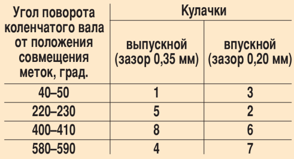 Еще раз проверяем зазор. При правильной регулировке щуп толщиной 0,20 или 0,35 мм должен входить в зазор с легким защемлением. Последовательно поворачивая коленчатый вал на пол-оборота, регулируем зазоры остальных клапанов в последовательности, указанной в таблице:
